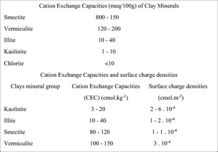 Clays such as kaolinite have a CEC of about 10 meq/100 g, while illite and smectite have CECs ranging from 25 to 100 meq/100 g. Organic matter has a very high CEC, ranging from 250 to 400 meq/100 g.