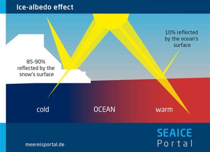 The sea ice absorbs less solar energy and keeps the surface cooler. Snow has an even higher albedo than sea ice, and so thick sea ice covered with snow reflects as much as 90 percent of the incoming solar radiation.