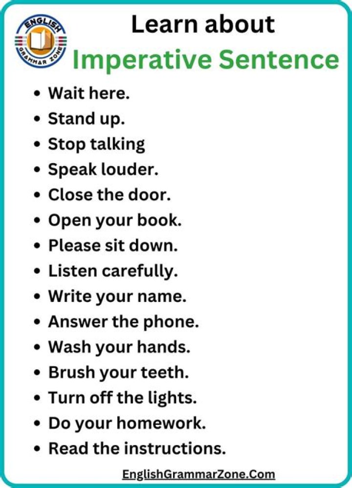An imperative sentence is a sentence that expresses a direct command, request, invitations, warning, or instruction. Imperative sentences do not have a subject; instead, a directive is given to an implied second person. For example, the sentence “Wash the dinner plates” commands the implied subject to wash the dishes.