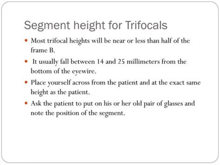 In bifocals and trifocals, measure the fitting height to the top of the segment from the bottom most edge of the lens. For bifocals, fit to the top of the lower lid, for trifocals to the lower edge of the pupil.