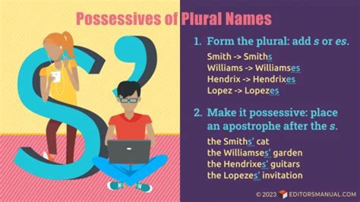 Plural and Possessive Names: A Guide Add -es for names ending in “s” or “z” and add -s for everything else. When indicating the possessive, if there is more than one owner add an apostrophe to the plural; if there is one owner, add ‘s to the singular (The Smiths’ car vs. Smith’s car).