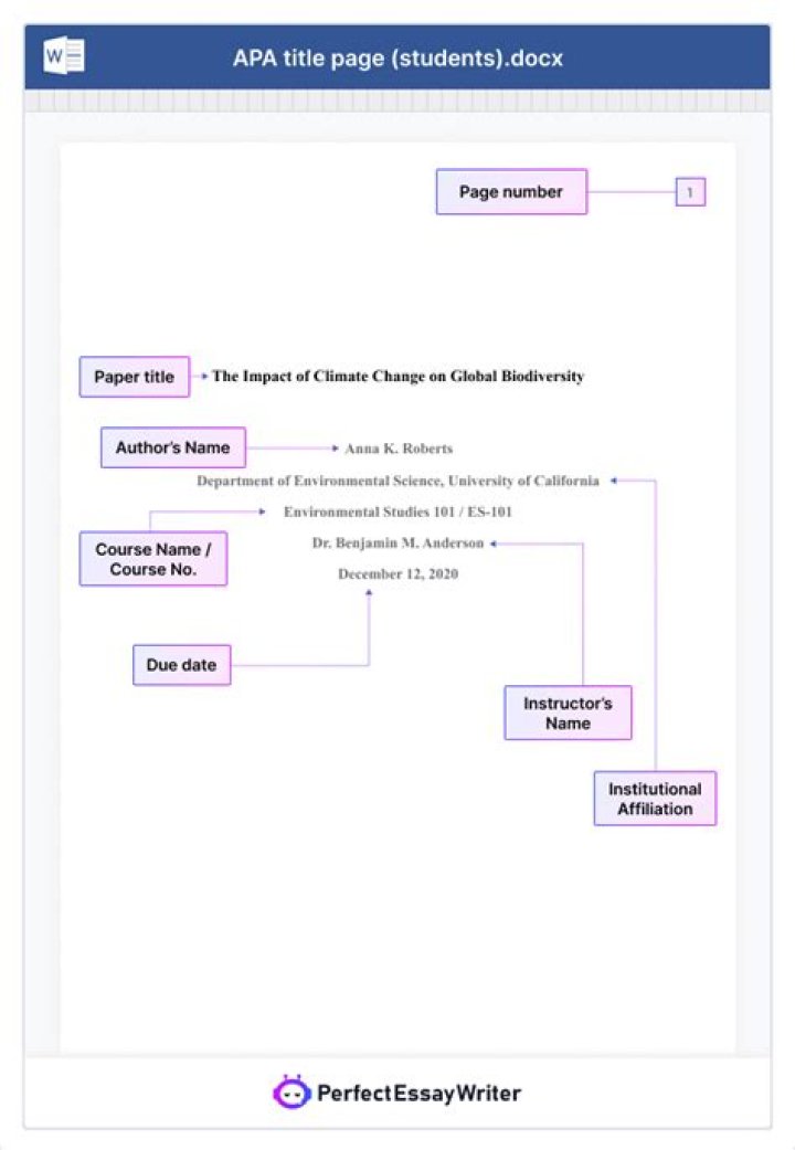 The title page should contain the title of the paper, the author’s name, and the institutional affiliation. A professional paper should also include the author note. A student paper should also include the course number and name, instructor name, and assignment due date.