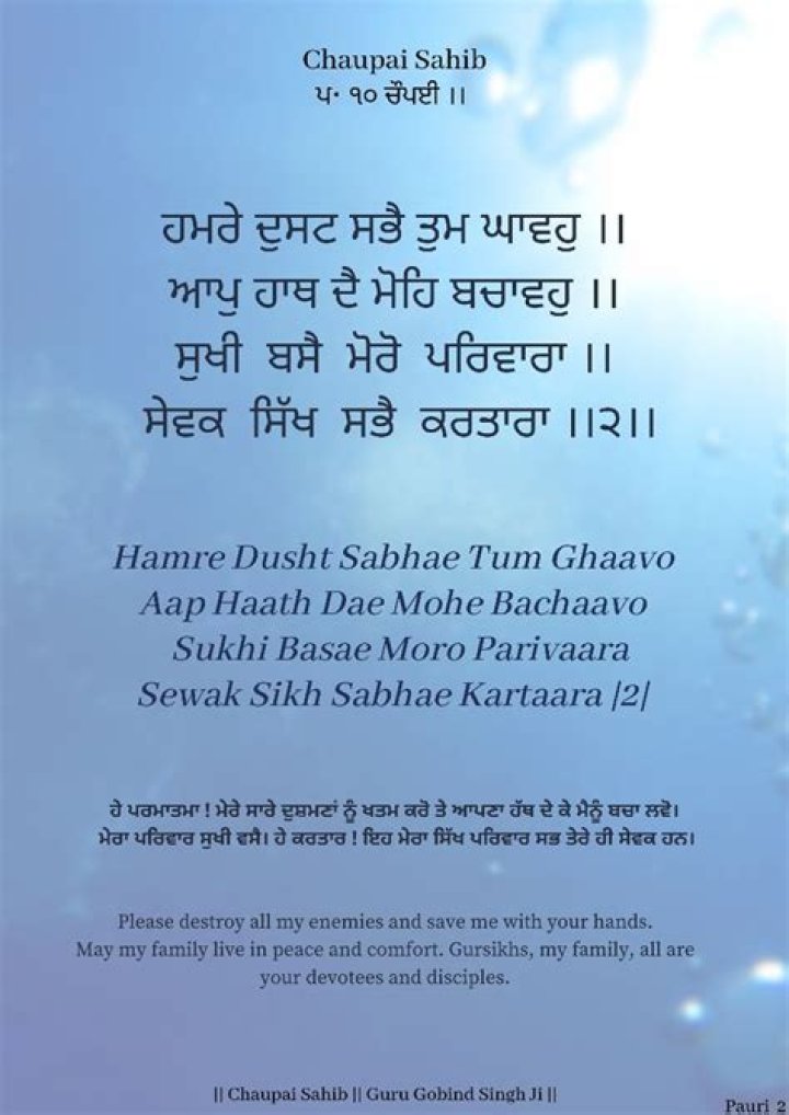 Chaupai Sahib, also known as Benti Chaupai, was composed by Guru Gobind Singh Ji. Chaupai Sahib is an Ardas or ‘request’ or ‘sincere plea’ to God for protection. Chaupai Sahib is also a part of the evening prayer of Rehras Sahib.
