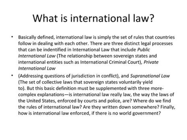 Sources of international law include treaties, international customs, general widely recognized principles of law, the decisions of national and lower courts, and scholarly writings.