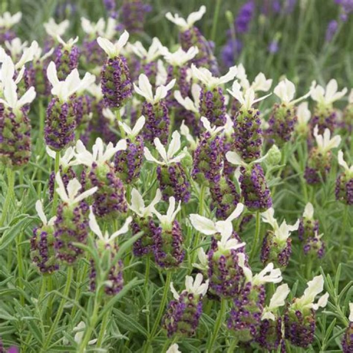 Lavandula stoechas (French lavender) varieties are less hardy than the English ones. They are easily distinguished in appearance, thanks to the distinctive tufted bracts at the top of each flower and grey serrated foliage.
