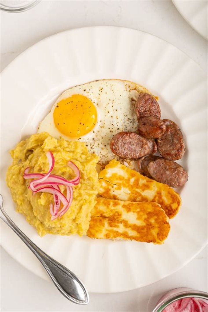 Mangu is a traditional Dominican breakfast item of mashed green plantains and topped with pickled red onions. This would typically be eaten with a fried white cheese and fried salami, but you can also eat this as your side dish to bacon or sausage and eggs.