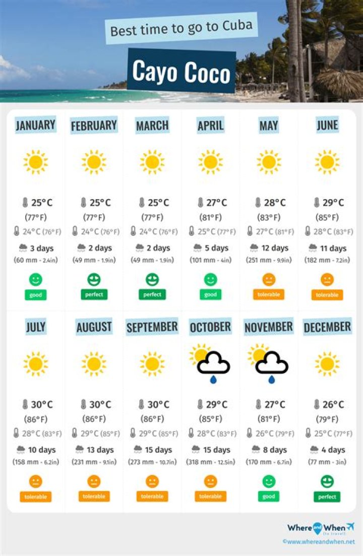 The coldest month is January with an average maximum temperature of 15°C (59°F). October is the most wet month. This month should be avoided if you are not a big fan of rain. July is the driest month.
