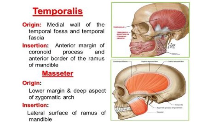 The temporalis muscle is a fan-shaped muscle located at each side of the head/skull near the area of the temples. This muscle’s action is to move the mandible up, back, and side-to-side. These movements allow the temporalis muscle to play an important role in biting and chewing food.