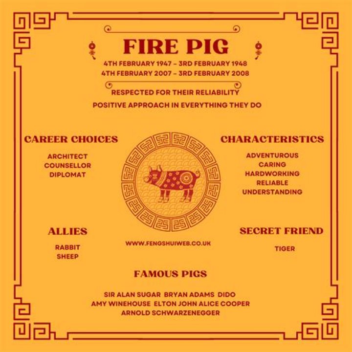 Fire Pig (1947, 2007) Personality: With Chinese Five Elements sign of Fire, people born in the Year of the Pig are friendly and hospitable, ready to provide help to people in need. They are good listeners, willing to help people out from their boredom.