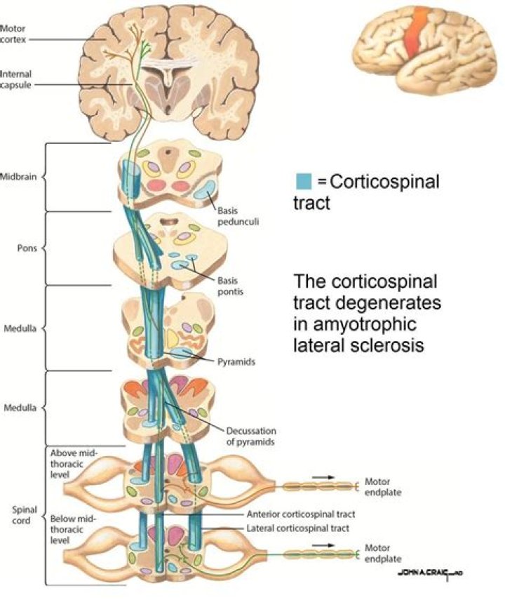 The corticospinal tract carries motor signals from the primary motor cortex in the brain, down the spinal cord, to the muscles of the trunk and limbs. The corticobulbar tract carries efferent, motor, information from the primary motor cortex to the muscles of the face, head and neck.