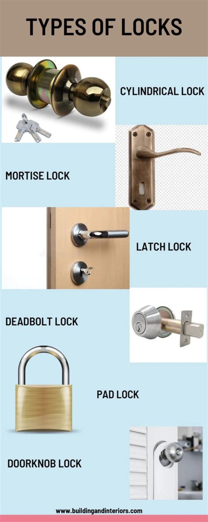 All Locked Down There are plenty of other door locks and many fall within the five categories of knobs, deadbolts, cam locks, padlocks and mortise locks. For example, lever handle door locks are used for inner doors and work much like knob locks.