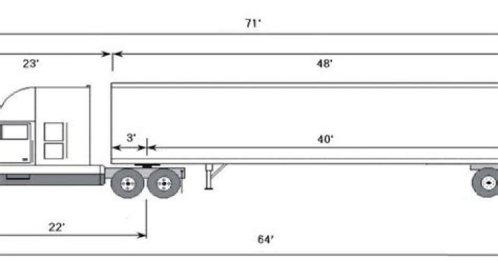 If we look at a 53 feet semi-trailer, dimensions vary ever so slightly between the overall and the interior. Overall length is 53 feet; overall width is 102″; and overall height is 13ft 6 inches.