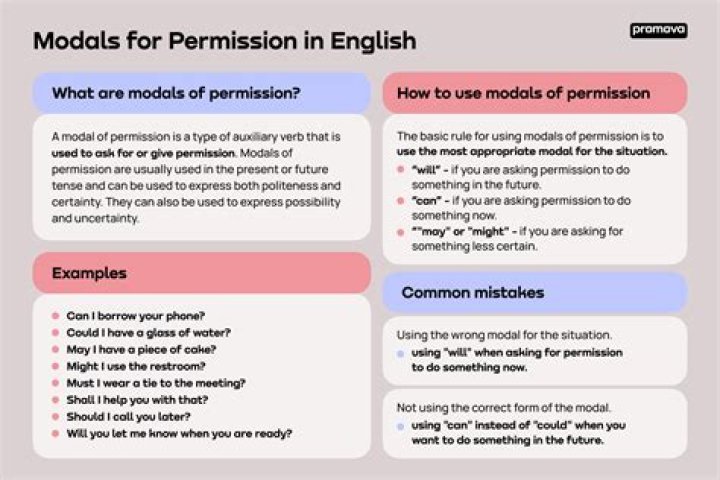 The modal verbs (or modals for short) of permission are can, could and may. These verbs are used to politely ask for permission, to make a request, and to offer help to someone….Can, May