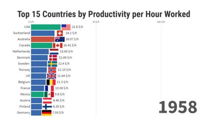 The United States ranks fifth, according to the OECD, contributing $68.30 to the country’s GDP per hour worked, countering claims that Americans are the most productive workers in the world. America put in more hours—33.6 per week on average—than all four of the European countries with higher productivity rankings.