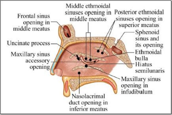 3.4. Hiatus semilunaris receives drainage from the ethmoid bulla. The maxillary sinus and often the frontal sinus, depending on the superior attachment of the uncinate process, drain into the ethmoid infundibulum.