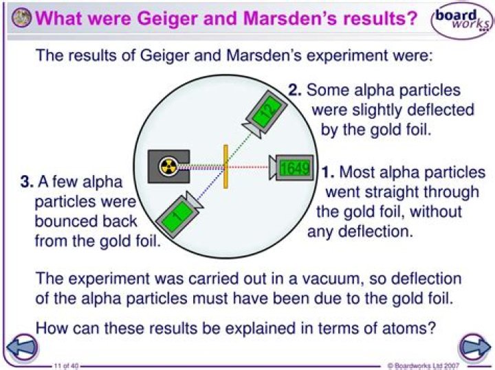 Geiger and Marsden fired the alpha particles at a target made from gold foil. The alpha particles were detected as small flashes on a fluorescent screen. Geiger and Marsden counted the flashes as they looked down a telescope tube at the screen.