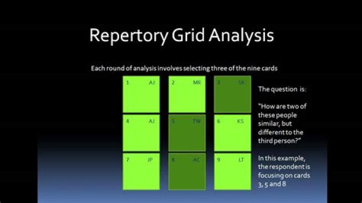 The role construct repertory test. Also known as the rep grid, it was invented in the 1950’s by George Kelly (1955). It is a technique for discovering the way in which a person interprets (construes, constructs) his or her reality.