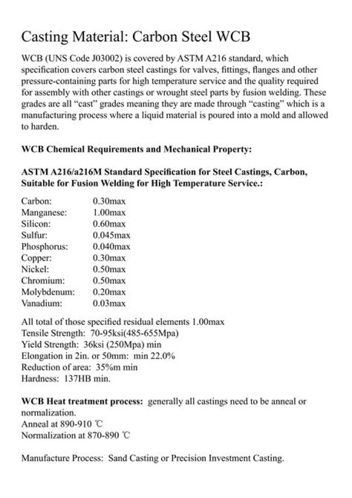 A216 WCB is carbon steel castings for valves, flanges, fittings, or other pressure-containing parts for high-temperature service and of quality suitable for assembly with other castings or wrought-steel parts by fusion welding.