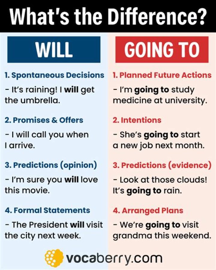 There are two future forms used in most conversations: the future with “will” and the future with “going to.” The main difference between the two forms is that “going to” is used for plans and intentions made before the moment of speaking, and the “will” to speak about the future at the moment of speaking.