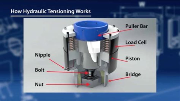 The objective of tensioning is to stretch the bolt, or stud, to a predetermined load, by using force to elongate the shank. Very little turning force is required. It is necessary to have some extra thread above the nut, which is used to attach the pulling cylinder, which is removed after completion.