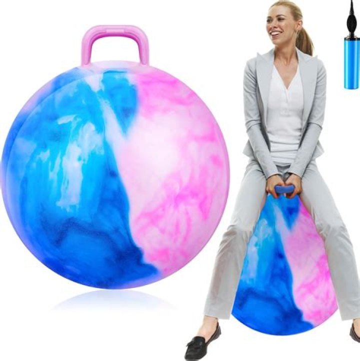 A space hopper (also known as a moon hopper, skippyball, kangaroo ball, bouncer, hippity hop, hoppity hop, sit and bounce, or hop ball) is a rubber ball (similar to an exercise ball) with handles which allow one to sit on it without falling off.