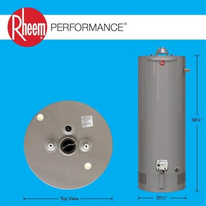 The Rheem Performance Atmospheric Gas Water Heater (30 Gallon) has an overall height of 46.25” (117.5 cm) and diameter of 19.75” (50.2 cm).