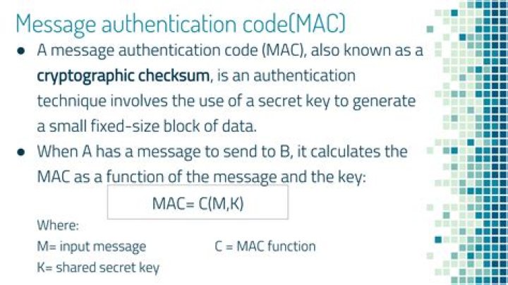 Message Authentication Code (MAC) Essentially, a MAC is an encrypted checksum generated on the underlying message that is sent along with a message to ensure message authentication. The sender uses some publicly known MAC algorithm, inputs the message and the secret key K and produces a MAC value.