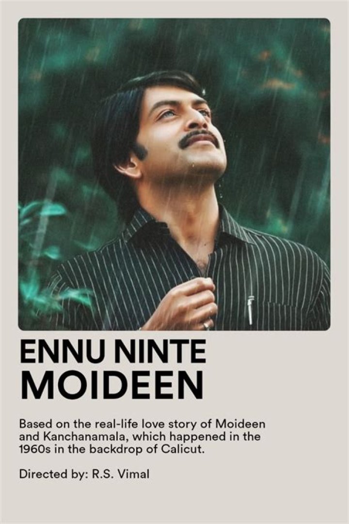 Ennu Ninte Moideen (English: Yours Truly, Moideen) is a 2015 Indian Malayalam-language biographical romantic drama film written and directed by R. S. Vimal, based on the real-life story of Kanchanamala and B. P. Moideen, which took place in the 1960s in Mukkam, Kozhikode.