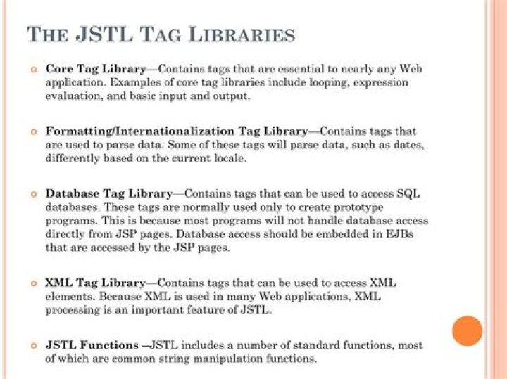 Features of JSTL: Provides support for conditional processing and Uniform Resource Locator (URL)-related actions to process URL resources in a JSP page. You can also use the JSTL core tag library that provides iterator tags used to easily iterate through a collection of objects.