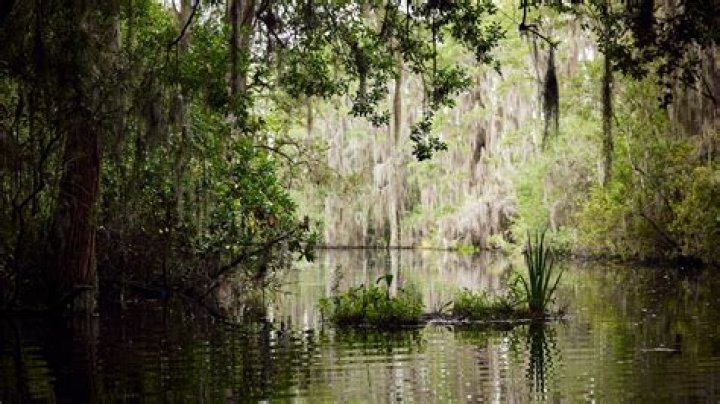 The Okefenokee Swamp is a shallow, 438,000-acre (177,000 ha), peat-filled wetland straddling the Georgia–Florida line in the United States. A majority of the swamp is protected by the Okefenokee National Wildlife Refuge and the Okefenokee Wilderness .