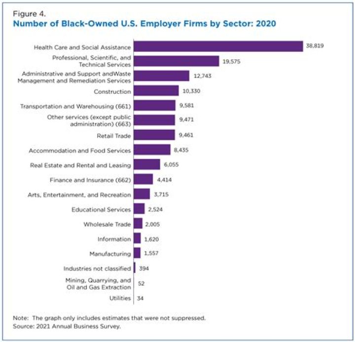The remaining 4% of Black-owned businesses are employer firms. 12 According to the Census Bureau’s Annual Business Survey, 32% of Black-owned employer firms were in the healthcare and social services sector. 13