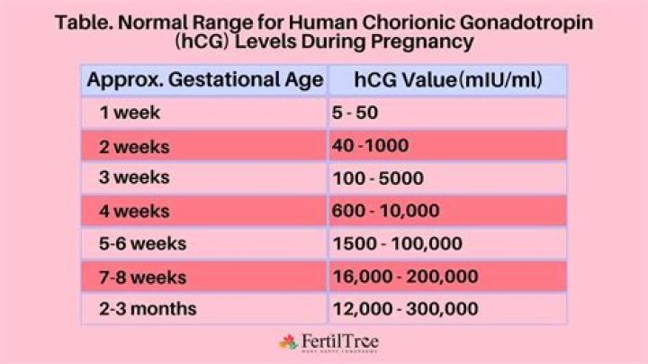 4 weeks: 5 – 426 mIU/ml. 5 weeks: 18 – 7,340 mIU/ml. 6 weeks: 1,080 – 56,500 mIU/ml. 7 – 8 weeks: 7, 650 – 229,000 mIU/ml.