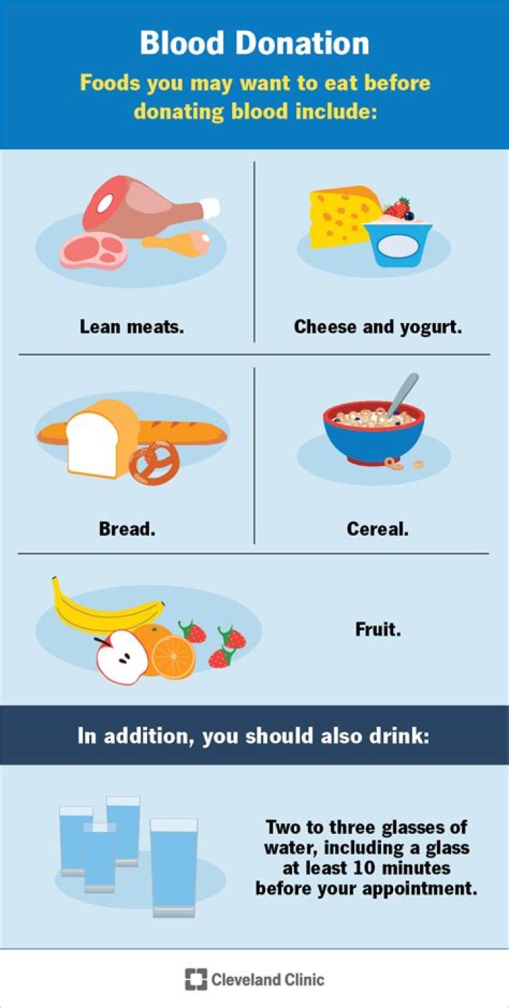 If you don’t have enough iron stored away prior to giving blood, you could become anemic, which can make you feel tired and weak. Iron-rich foods include red meat, eggs, poultry, fish and leafy green vegetables.