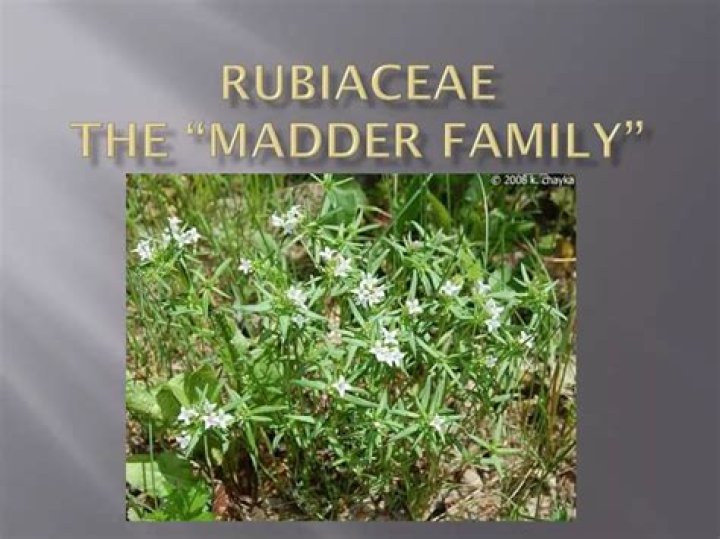 Systematics The family Rubiaceae is named after Rubia, a name used by Pliny the Elder in his Naturalis Historia for madder (Rubia tinctorum). The roots of this plant have been used since ancient times to extract alizarin and purpurin, two red dyes used for coloring clothes.